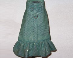 Watch the sparkle of this gorgeous designer light teal blue micro-sequined dog dress by Emma Rose Design. This superbly made designer dog dress has a dropped waist and looks great on any dog. The dress is fully lined with the same light teal color matte satin. You will not believe how beautiful this looks until you try it on your pampered pet. Any dog will be outstanding in this delightful dog outfit. Need some sparkle and pizzazz to your dog clothes? Look not further. A fabric bow near the nape of the neckline is all this dress needs to be perfect. A ruffled bottom is always attractive to any dog dress. A color that is spectacular and a design created with your dogs beauty in mind. Sizes: -XSmall: Size 8 -Small: Size 10 -Medium: Size 12 -Large: Size 14'